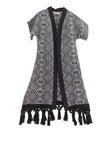 Diese Umhänge wurden von Nashielly entworfen und geschneidert, der einen Tretwebstuhl von Santa Ana Chiautempan in Tlaxcala verwendete. Es ist ein kurzärmeliger Umhang, der die Taille betont und Fransen am unteren Rand hat.