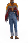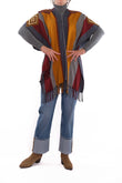 Das Maria Stripped Cape in warmen Farben wurde von dem von Maria organisierten Kollektiv in Zinacantan hergestellt. Die Technik ist der Rückenriemenwebstuhl und hat Brokat in der Mitte vorne und hinten. Dieser Umhang kann auf zwei Arten getragen werden: kurz, wenn der Brokat in der Mitte liegt und bis zum Bauchnabel reicht, oder lang, wenn der Brokat auf den Schultern liegt und somit vorne und hinten länger ist.