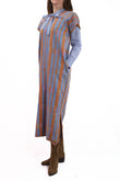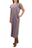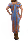 Huipil Dress San Juan blue and brown striped with multicolor brocade
