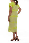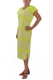 The Huipil Dress San Juan yellow neon striped is a one panel huipil, slightly open at the bottom side. The word huipil comes from the Nahuatl word huipilli, which means blouse or ornate dress. The huipil speaks and has its own voice. Through each embroidery and stitch that craftsmen and craftswomen have captured in it, it tells stories and transmits feelings.